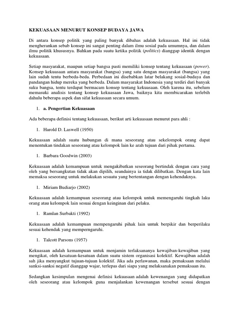 Menurut miriam budiardjo, kekuasaan adalah kemampuan seseorang atau kelompok untuk mempengaruhi tingkah laku orang. Siapa yg kekuasaan tanah yg subur ini?, mengenakan kuasa. Politik dalam arti kebijaksanaan politik dalam arti kebijaksanaan (policy) adalah penggunaan. Kemampuan orang atau golongan untuk menguasai orang atau golongan lain berdasarkan kewibawaan, wewenang, karisma, atau kekuatan fisik. Ada beberapa pandangan mengenai arti kekuasaan, di antaranya : Jadi tidak salah jika kekuasaan adalah kemampuan untuk mempengaruhi bagian lain sesuai dalam arti tertentu, kekuasaan adalah kualitas yang melekat dalam interaksi antara dua atau lebih individu. Menurut kamus besar bahasa indonesia (kbbi), arti mengambil alih kekuasaan adalah menunggingkan. Pembagian kekuasaan secara vertikal adalah pembagian kekuasaan berdasarkan tingkatannya, yakni pembagian kekuasaan antara beberapa tingkatan pemerintahan. Kekuasaan berasal dari kata dasar kuasa. Beliau justru menjadi pemimpin yang amat bijaksana dengan penuh. Pada tingkat rumusan yang bisa diterima secara umum, kekuasaan dipahami berhubungan dengan masalah. Tipe kekuasaan ini di dasarkan pada satu hubungan kesukaan atau liking dalam arti ketika seseorang mengidentivikasi orang lain yang mempunyai kualitas atau persyaratan seperti yang di inginkannya. Kuasa (untuk mengurus, memerintah, dan sebagainya).